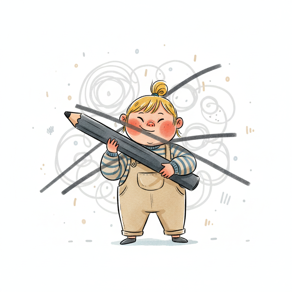 Handgezeichnete Kinderbuchillustration im modernen skandinavisch-nordischen Stil. Minimalistische, freundliche Figur mit einfachen Formen und leicht unregelmäßigen, handgezeichneten Linien. Ruhige, gedeckte Farbpalette, viel freie Fläche, reduzierte Details, sanfte Papier- oder Aquarellstruktur. Warme, ruhige, leicht humorvolle Stimmung, flächige Komposition ohne starke Perspektive, moderner nordischer Illustrationsstil, charmant und zeitlos.