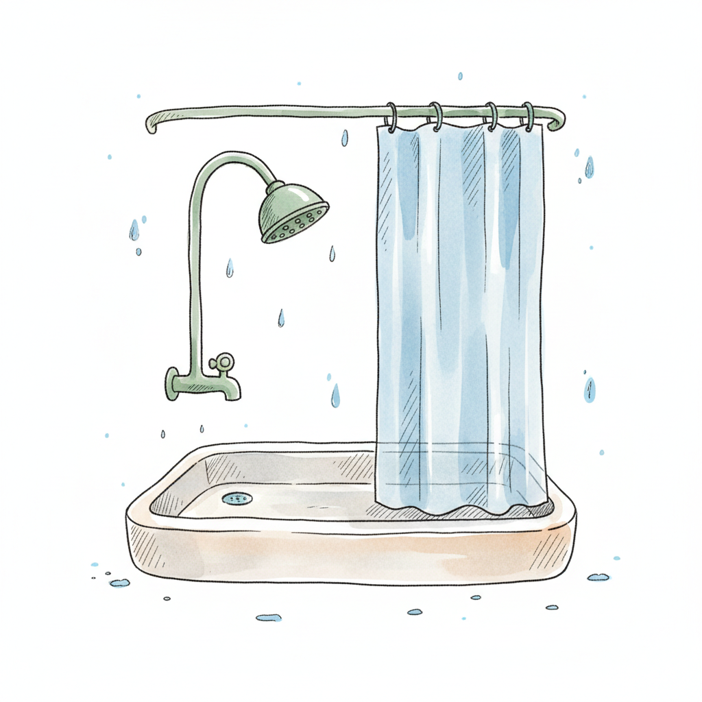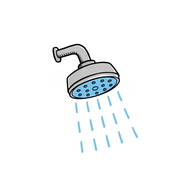 Cartoon-Illustration einer Dusche mit Duschkopf, blauem Vorhang und fallenden Wassertropfen.