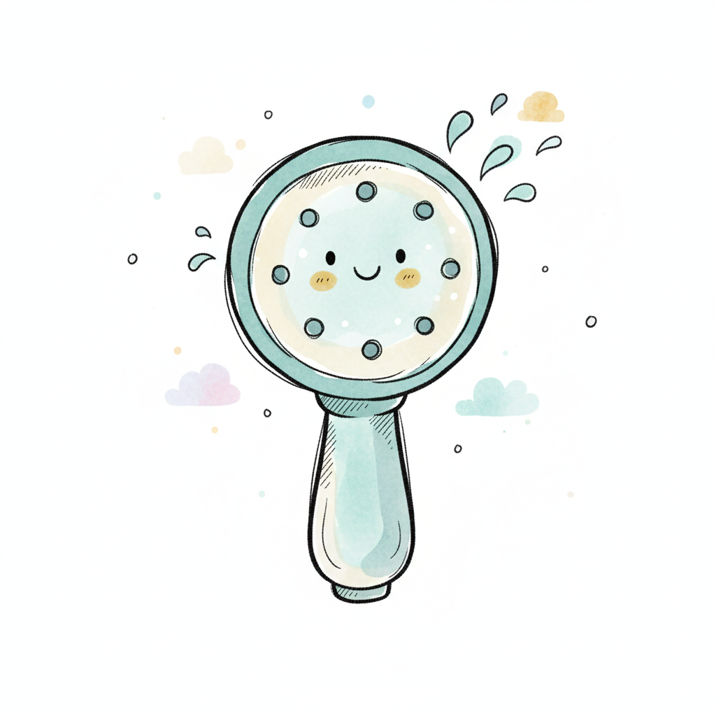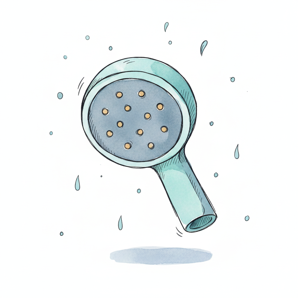 Aquarell-Illustration eines hellblauen Duschkopfs mit Wassertropfen auf weißem Hintergrund.