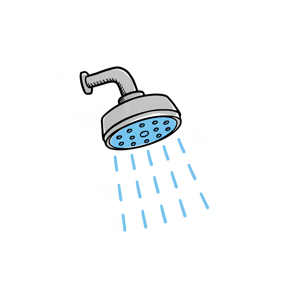 Grauer Duschkopf im Comic-Stil, aus dem blaue Wassertropfen fallen.