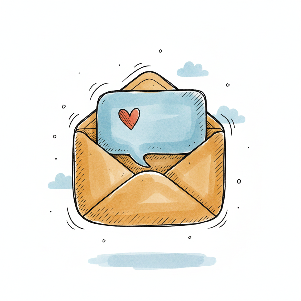 Handgezeichneter Umschlag mit blauer Sprechblase und rotem Herz, symbolisiert eine Liebesbotschaft.