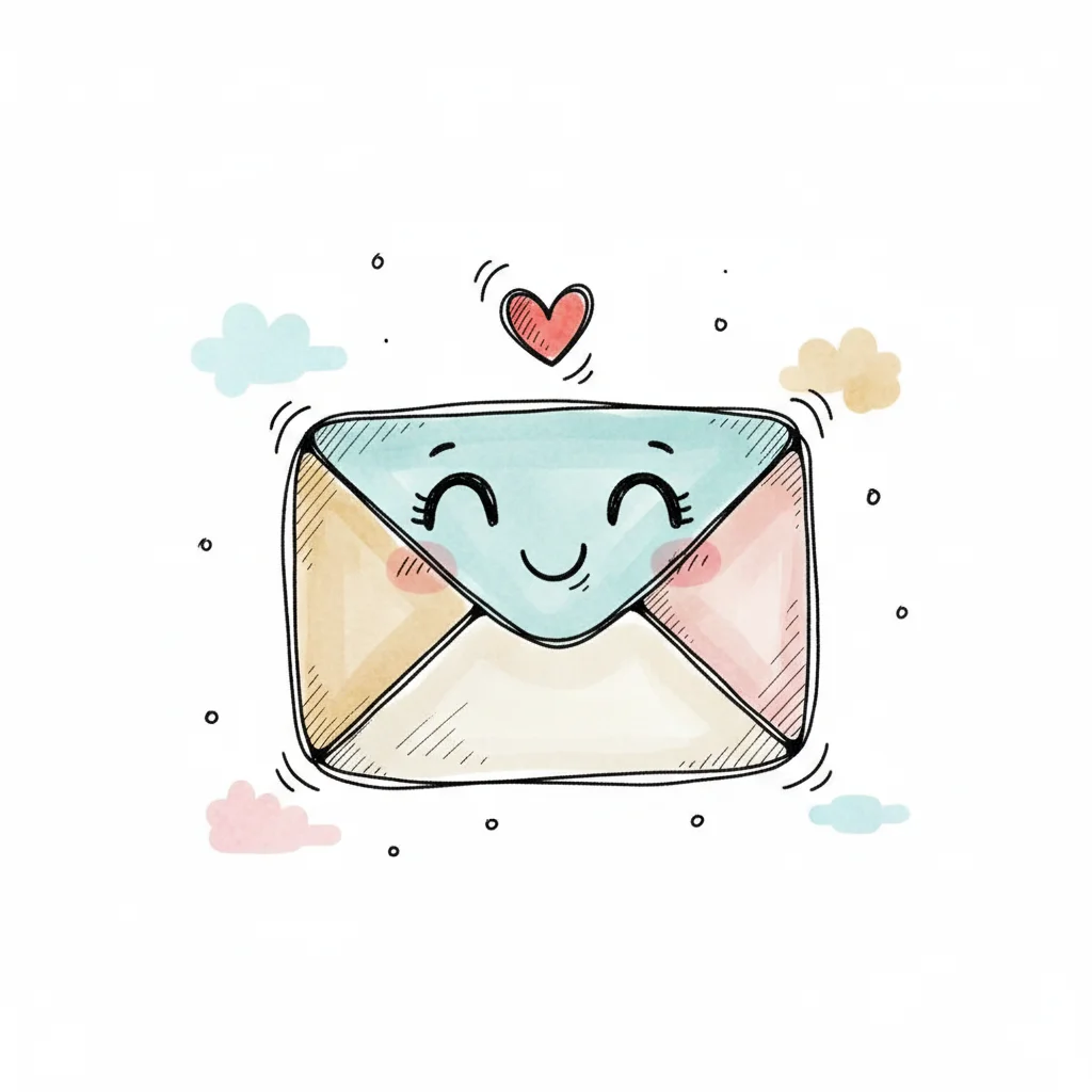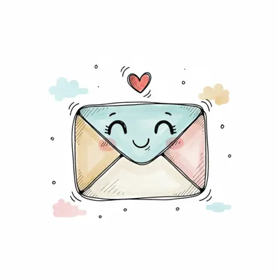 Niedlicher, lächelnder Briefumschlag mit Herz und Aquarell-Details.