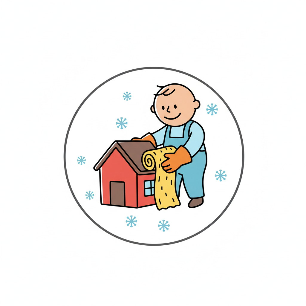Cartoonfigur isoliert Hausdach mit Dämmmaterial, Schneeflocken im Hintergrund. Symbolisiert Kälteschutz.