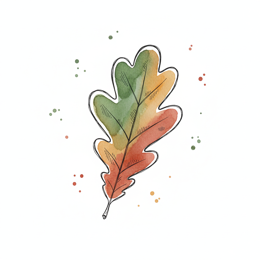 Buntes Eichenblatt in Aquarell-Optik, von Grün zu Braun verlaufend, mit schwarzen Konturen.