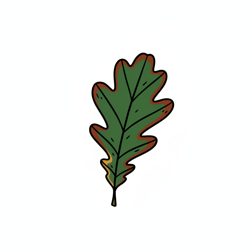 Eine stilisierte, grüne Eichenblatt-Illustration mit braunem Rand auf weißem Hintergrund.