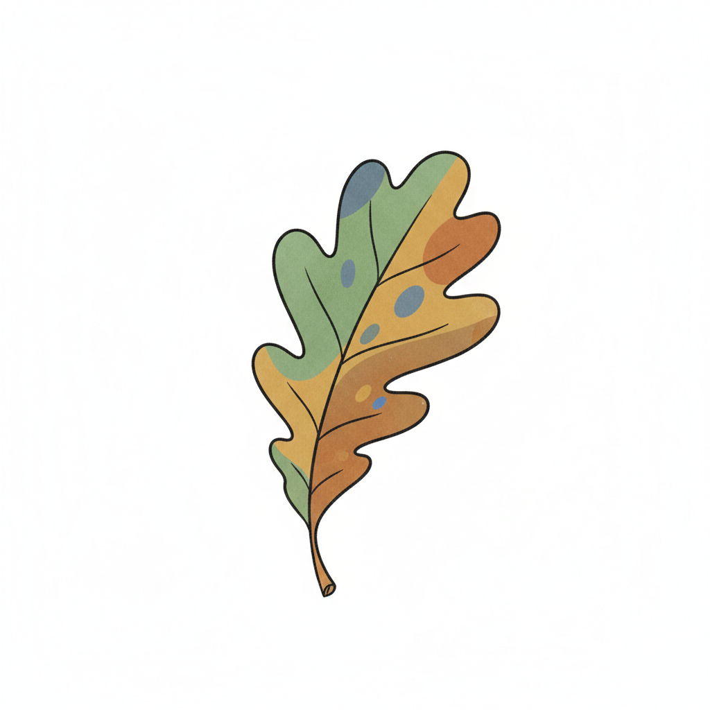 Illustriertes Eichenblatt in Herbstfarben (grün, braun, orange) mit blauen Flecken auf weißem Grund.