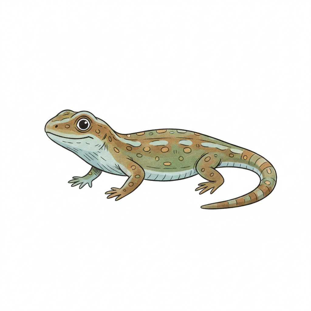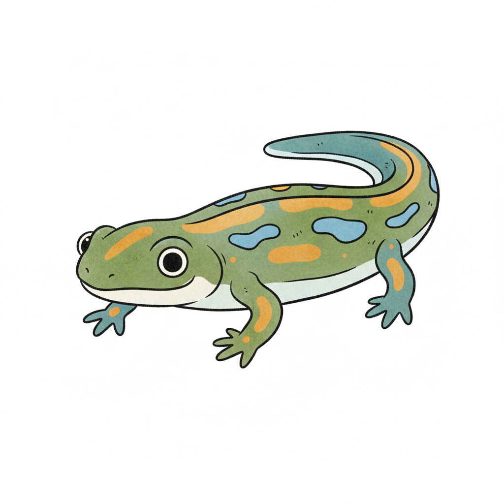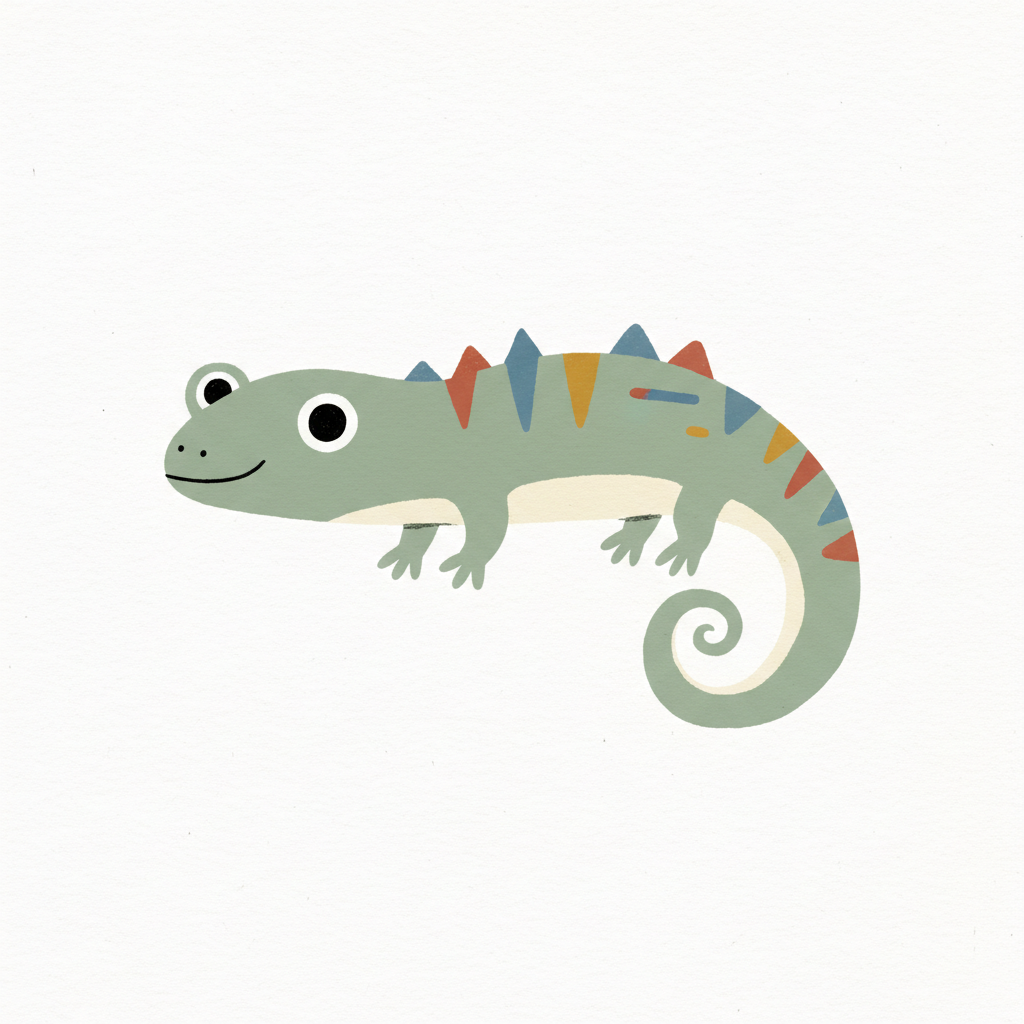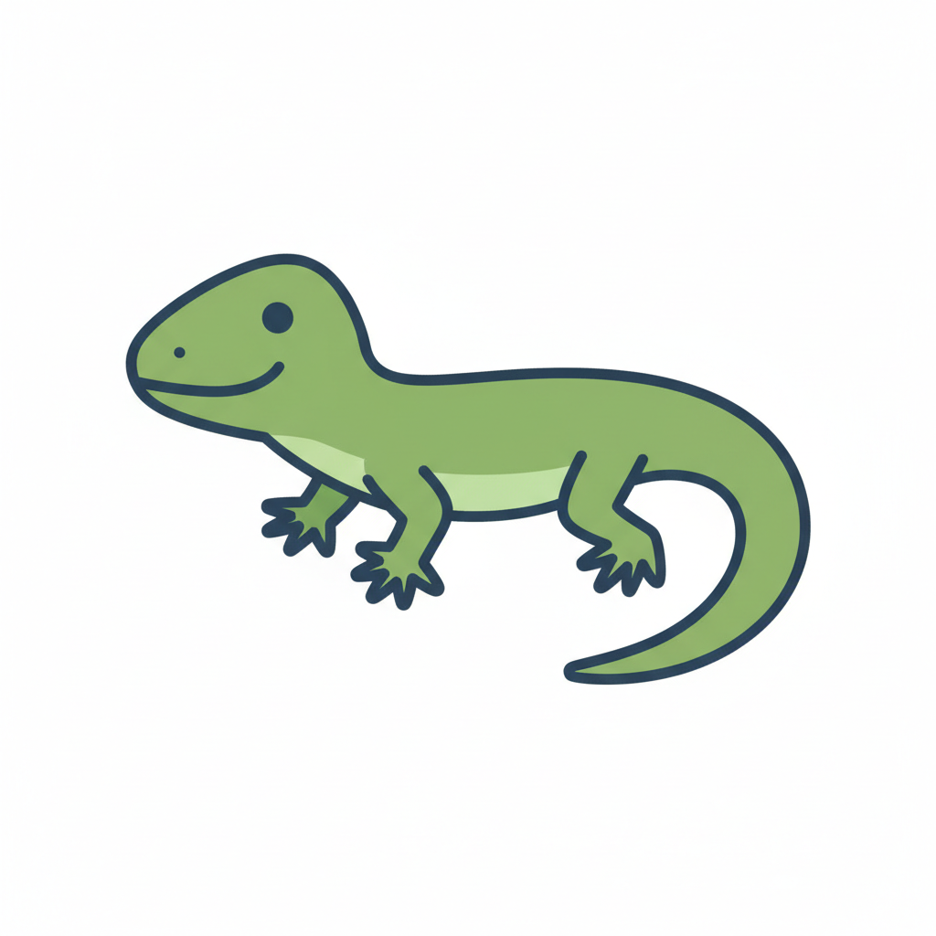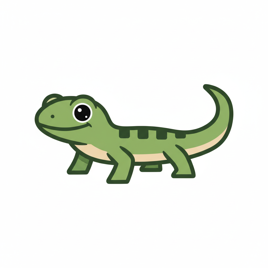 Ein niedlicher, cartoonhafter grüner Salamander mit großen Augen.