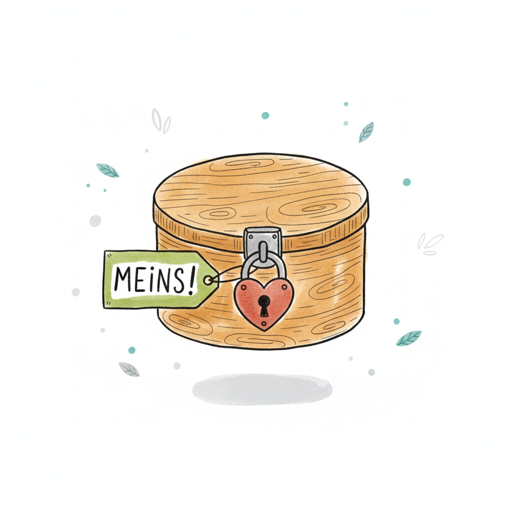Holzkiste mit Schloss und Herz, beschriftet mit 'MEINS!'.