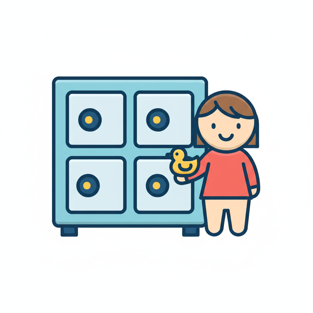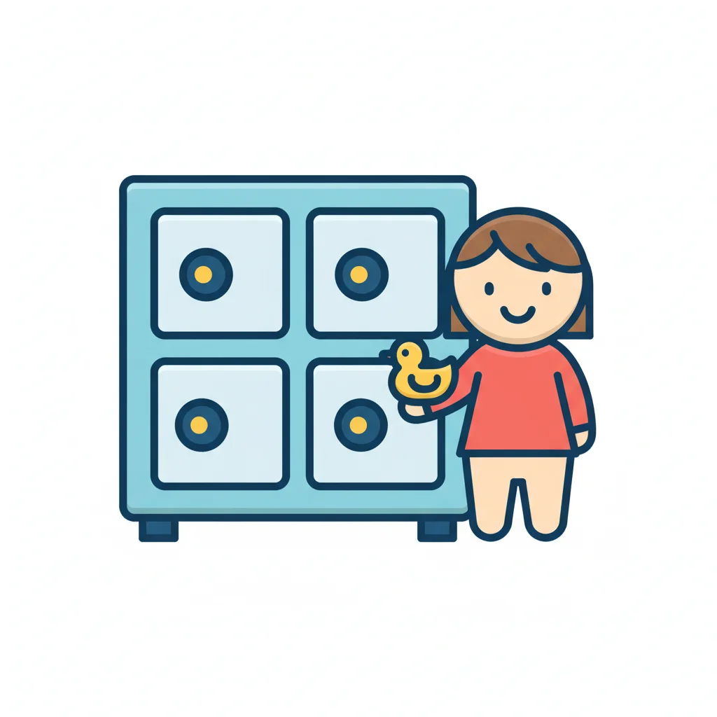 Mädchen mit einem Entchen vor einem Schrank mit vier Fächern.