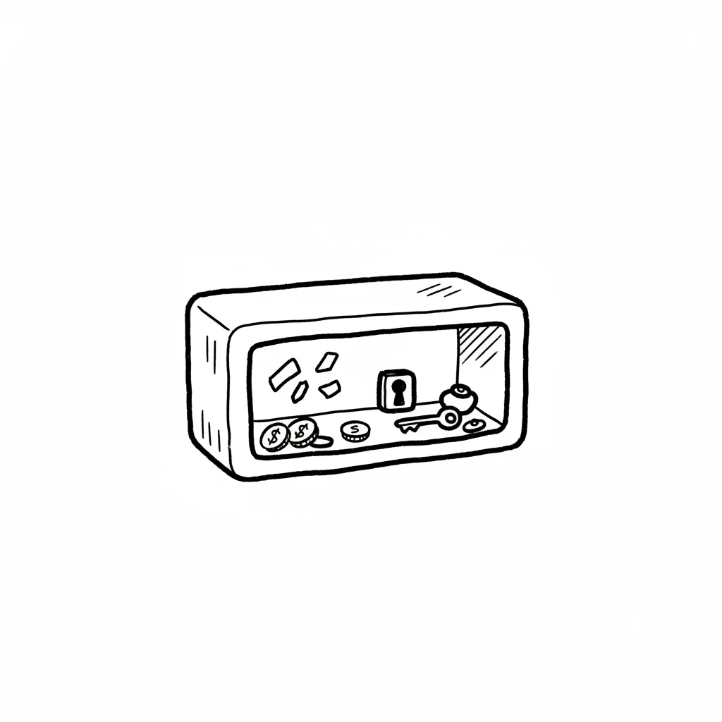 Ein einfacher Geldschrank mit Münzen und einem Schlüssel darin.