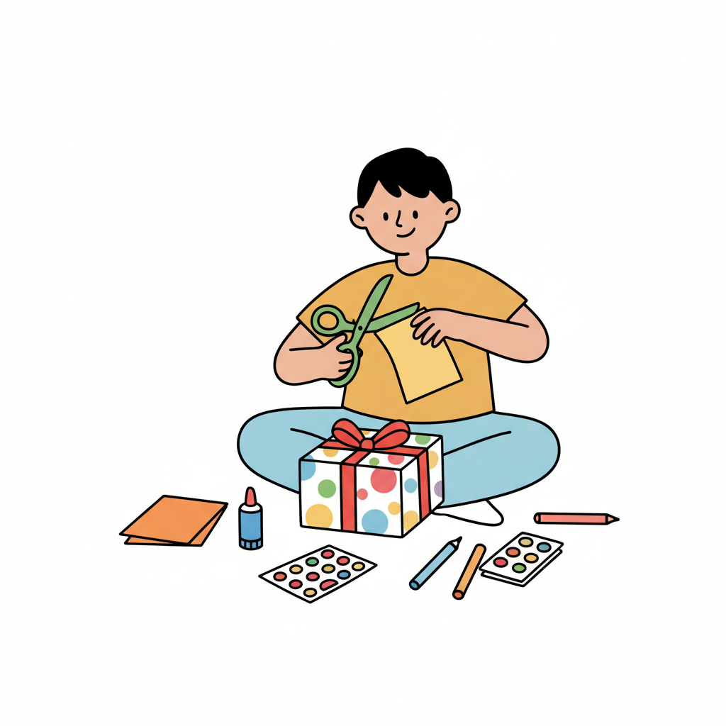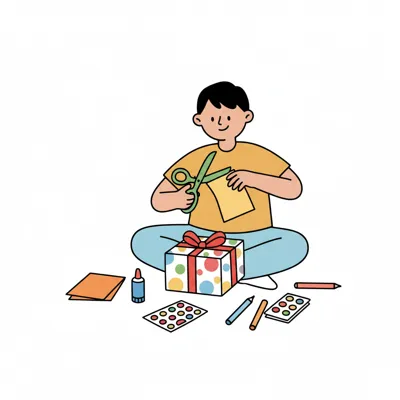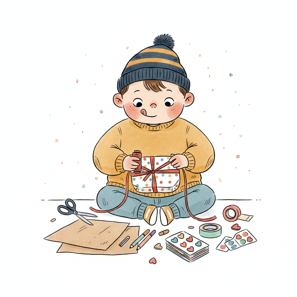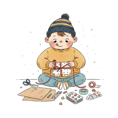 Ein Junge verpackt ein Geschenk mit Freude und kreativen Materialien.