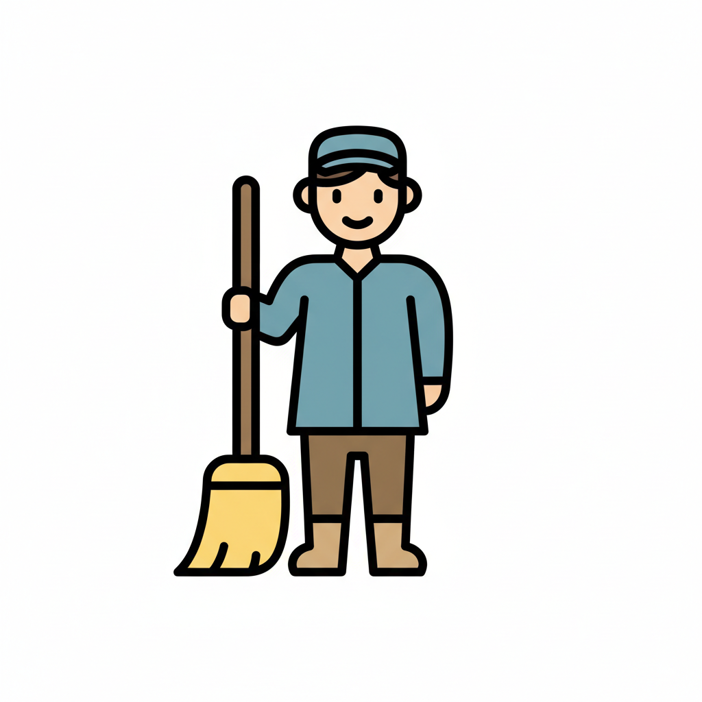 Lächelnde Cartoonfigur eines Reinigungsmanns mit Besen und Mütze.