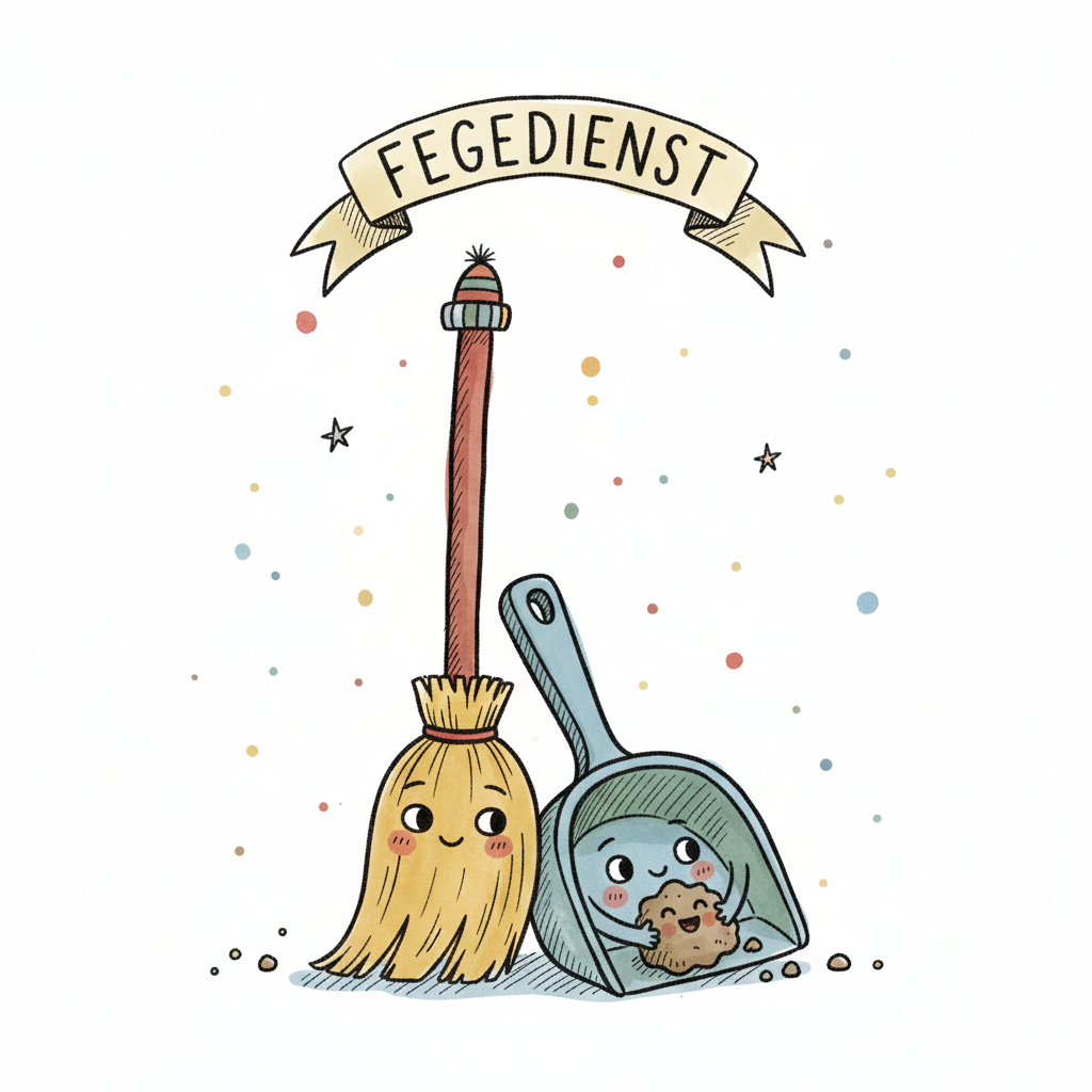 Niedliche Cartoon-Besen und Kehrschaufel mit Gesichtern, die "Fegedienst" verrichten.