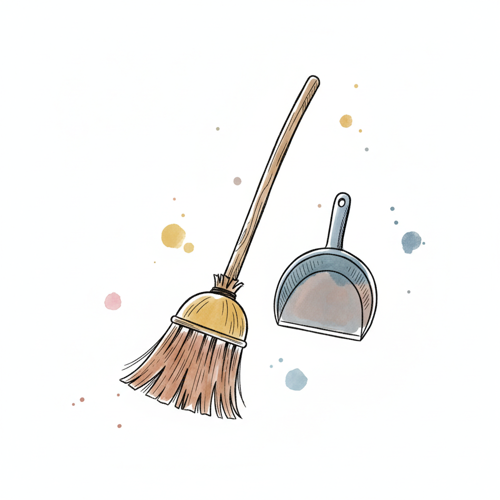 Aquarell-Illustration von Besen und Kehrschaufel auf weißem Hintergrund mit Farbspritzern.