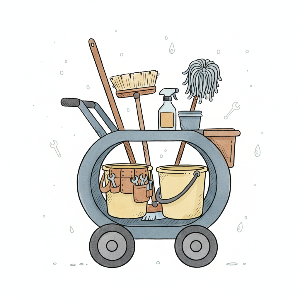 Illustrierter Reinigungswagen mit Besen, Mopp, Eimern und Werkzeugen auf weißem Hintergrund.