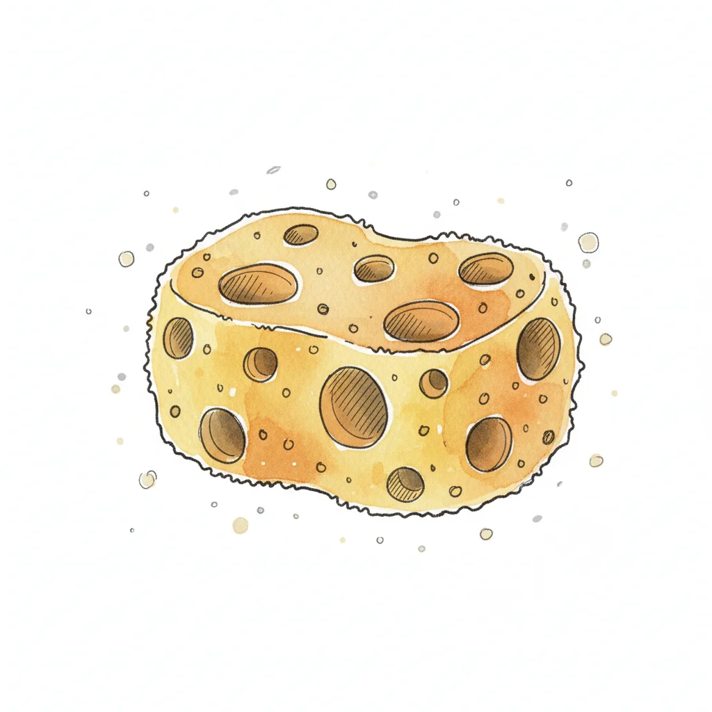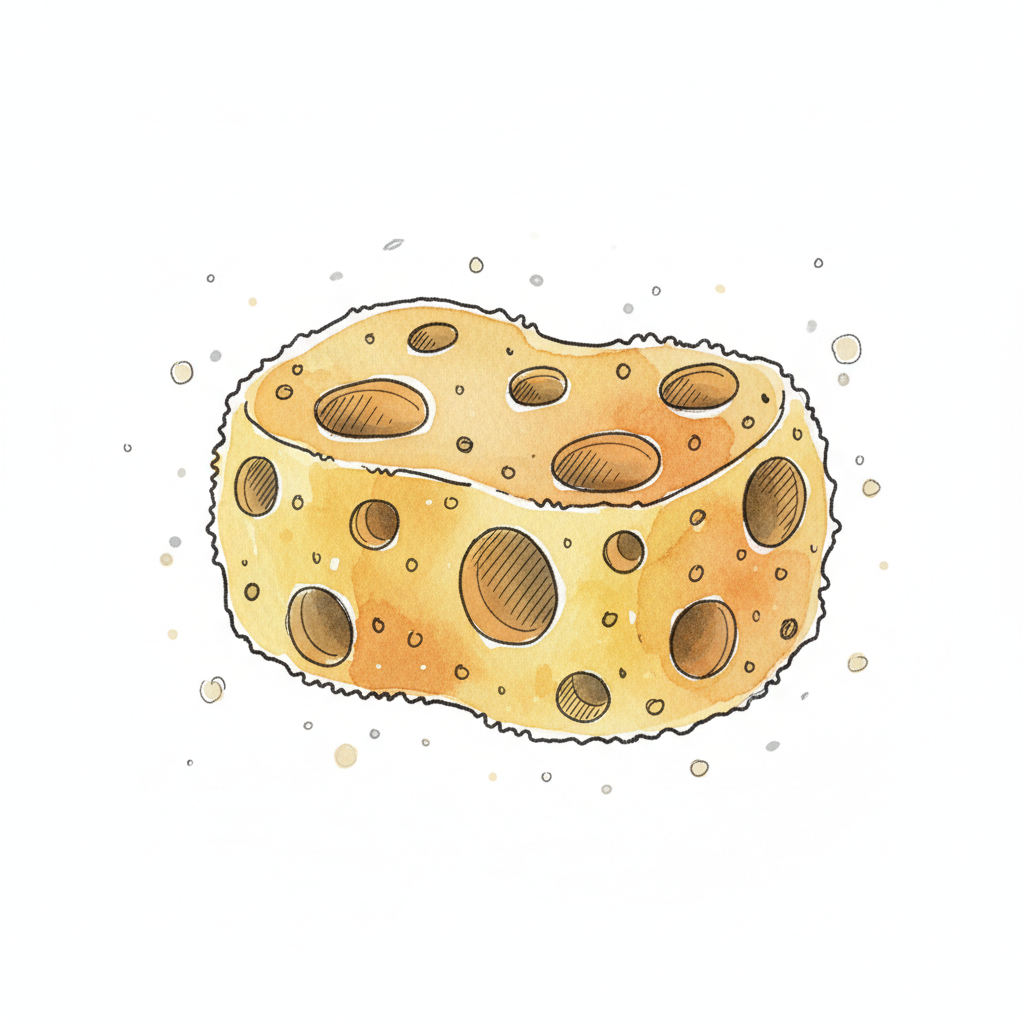 Gelber, poröser Schwamm in Aquarell-Optik mit vielen Löchern auf weißem Grund.