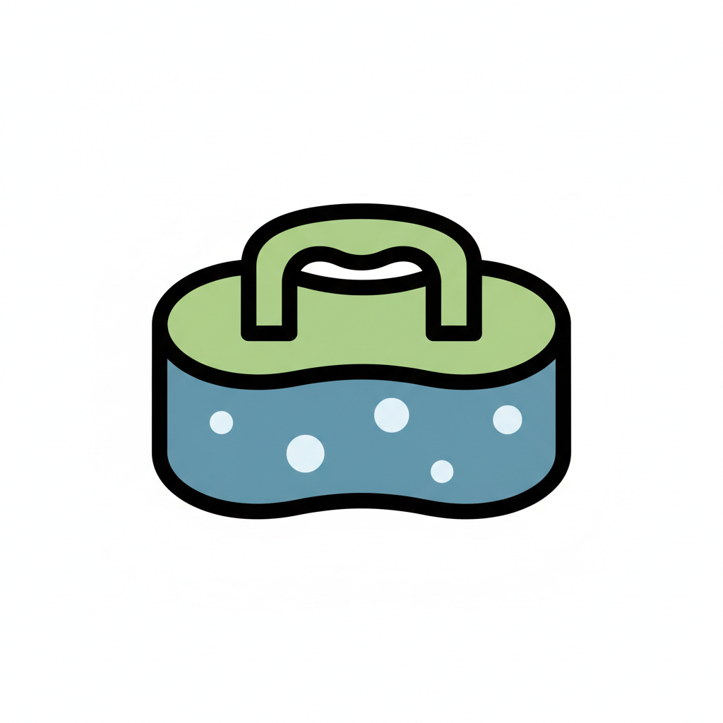 Stilisierter Badeschwamm mit Griff in Grün und Blau, verziert mit Blasen.