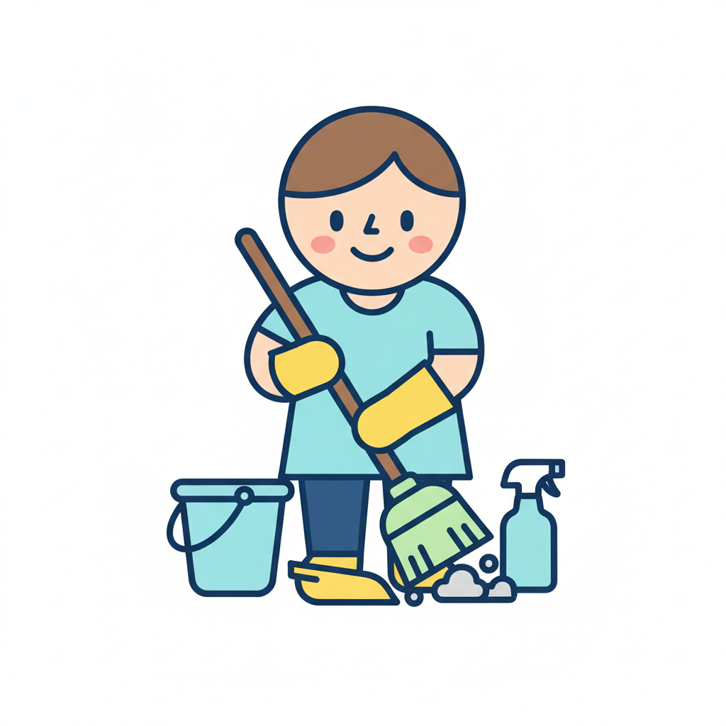 Ein lächelnder Cartoon-Charakter fegt mit Besen und Kehrschaufel, trägt Schürze und Handschuhe.