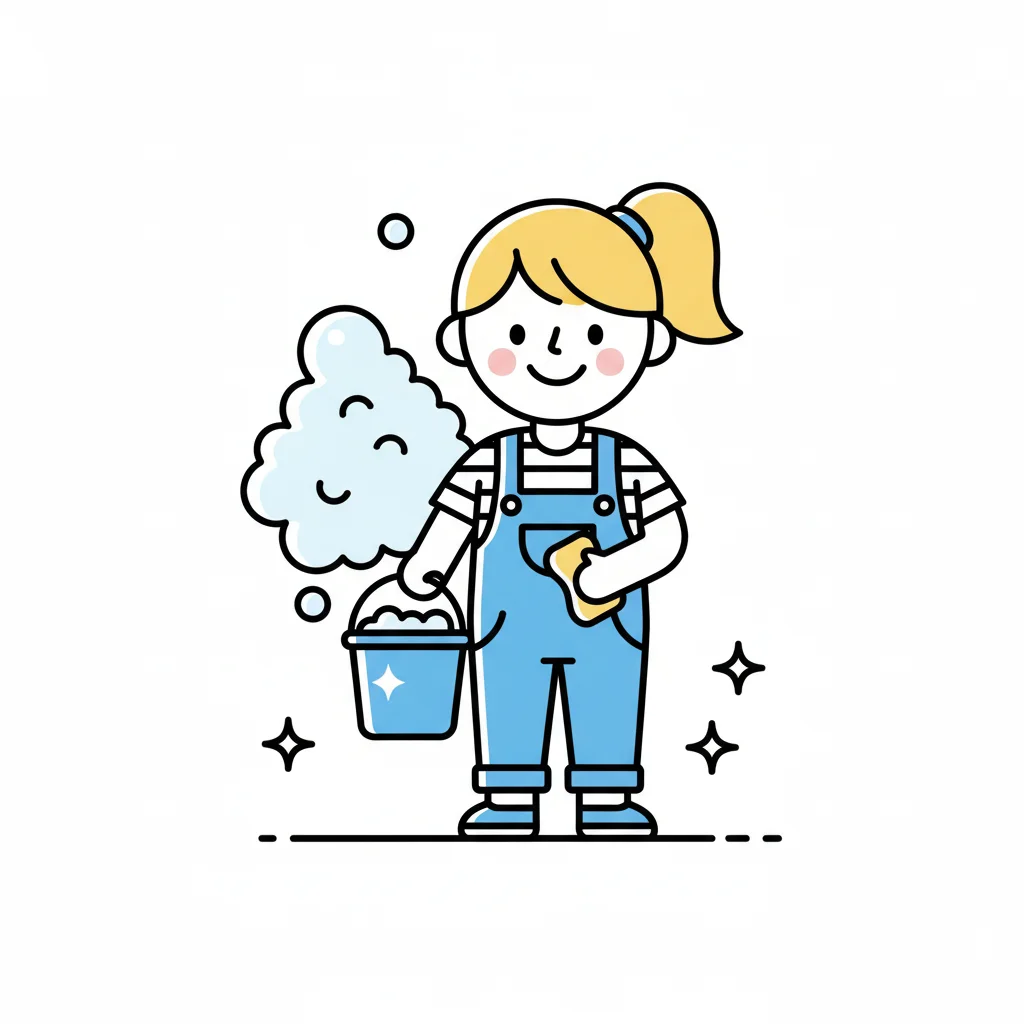 Fröhliche Cartoon-Figur in Latzhose mit Eimer und Schwamm beim Putzen, umgeben von Seifenblasen.