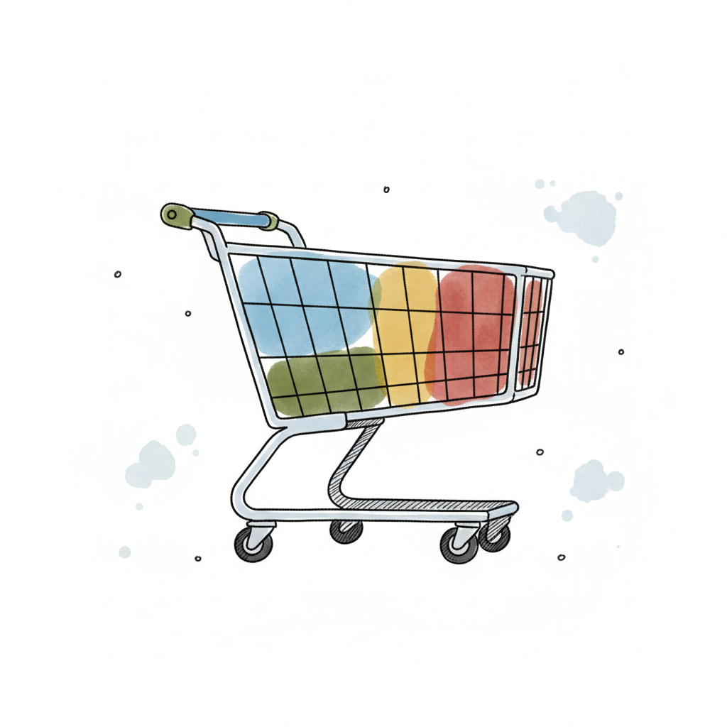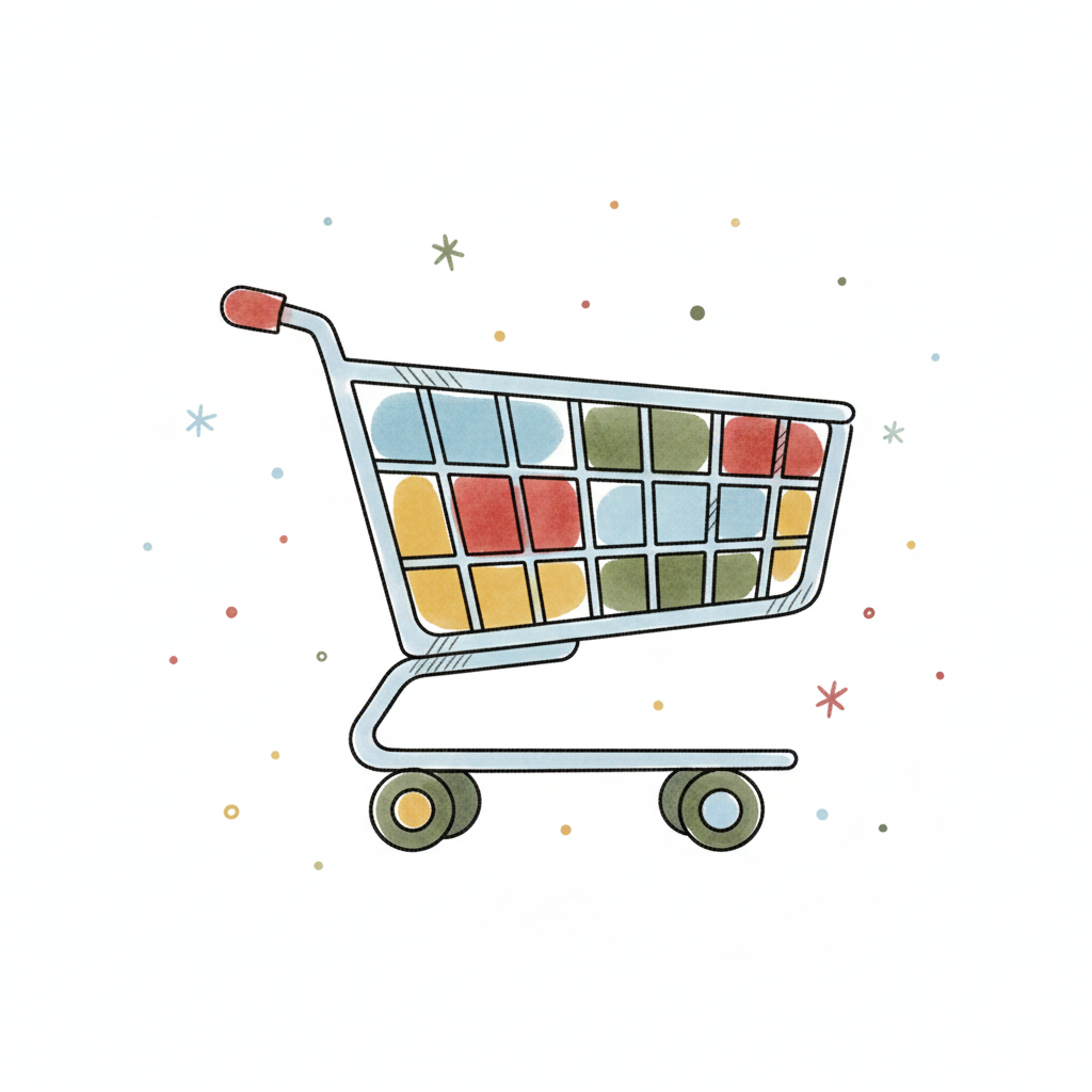 Aquarell-Illustration eines Einkaufswagens, gefüllt mit bunten, abstrakten Formen auf weißem Grund.