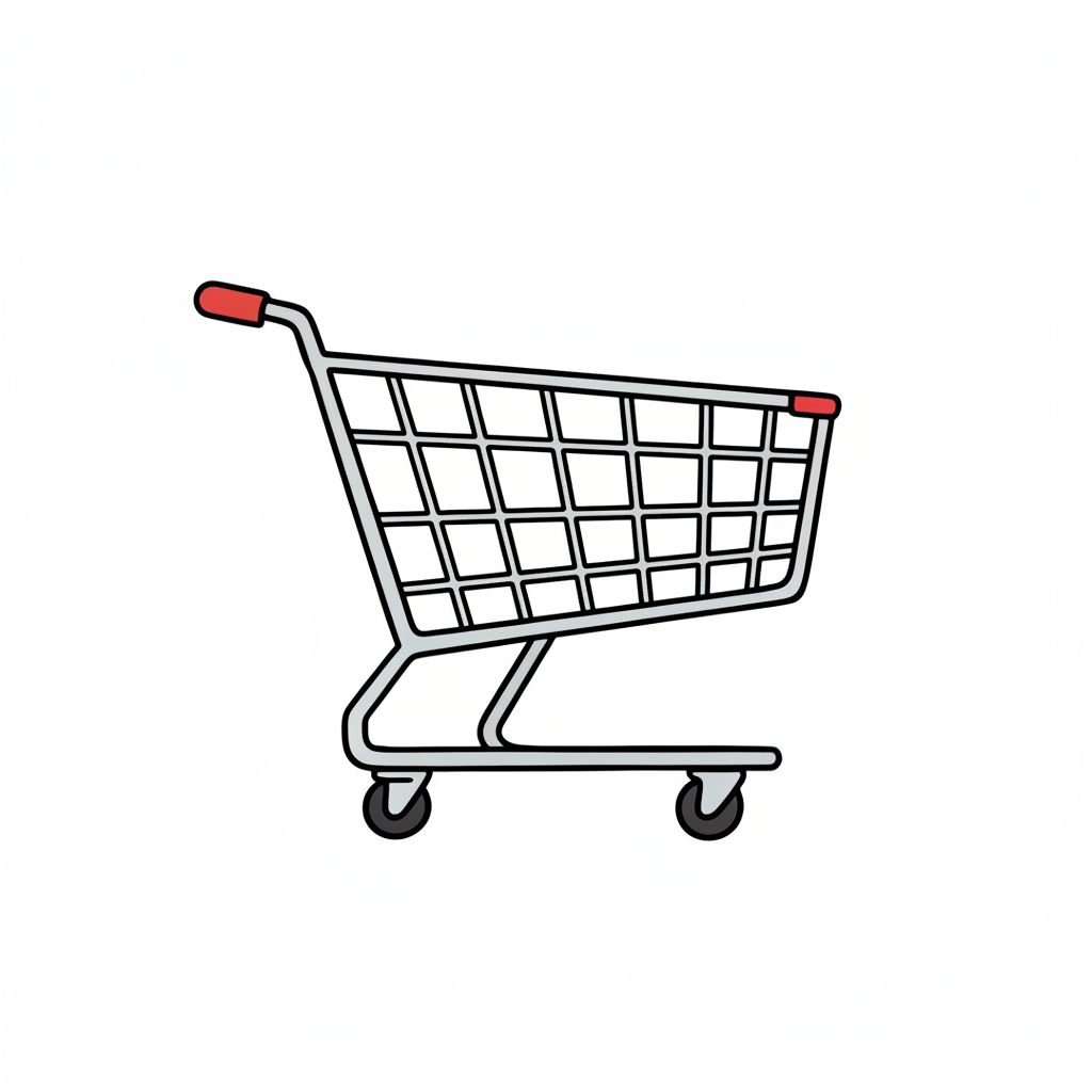 Einfache Illustration eines Einkaufswagens mit rotem Griff und Gitterkorb auf weißem Hintergrund.