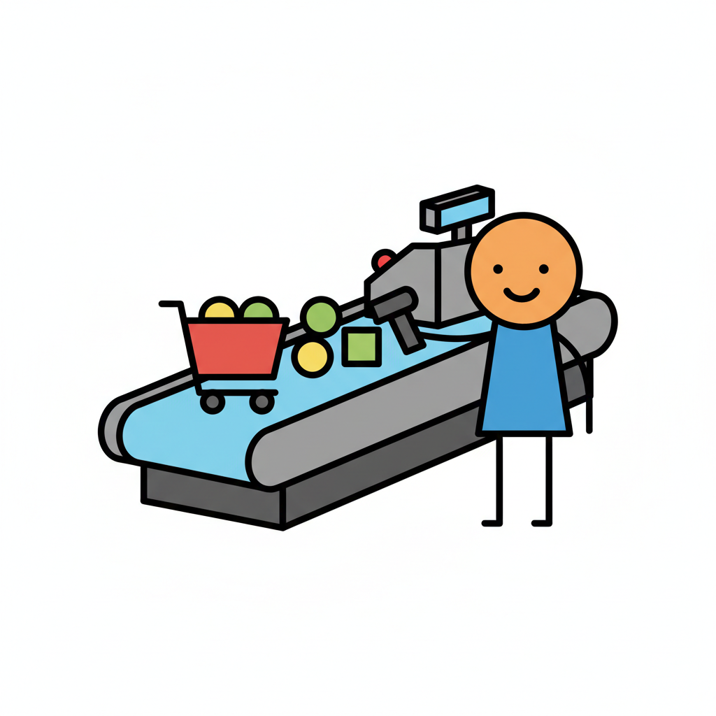 Strichmännchen an Supermarktkasse mit Einkaufswagen und Waren auf dem Förderband.