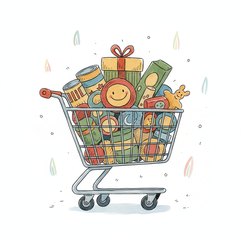 Ein vollgepackter Einkaufswagen mit bunten Produkten, Geschenken und einem lächelnden Gesicht.