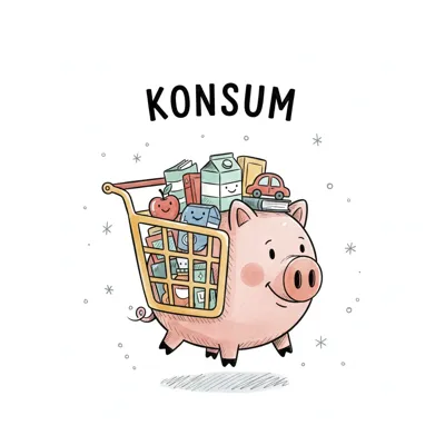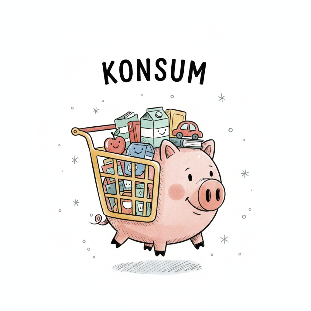 Ein glückliches Sparschwein schiebt einen Einkaufswagen voller Konsumgüter. Oben steht 'KONSUM'.
