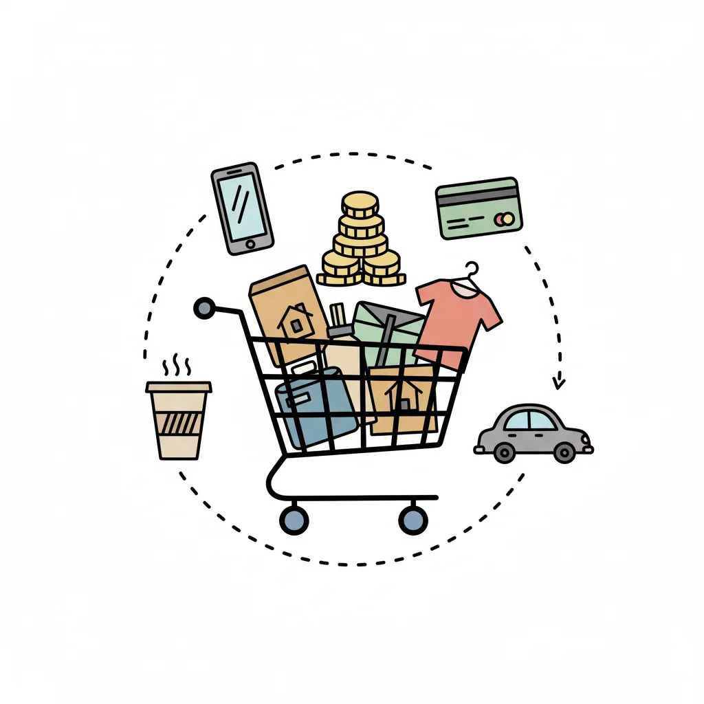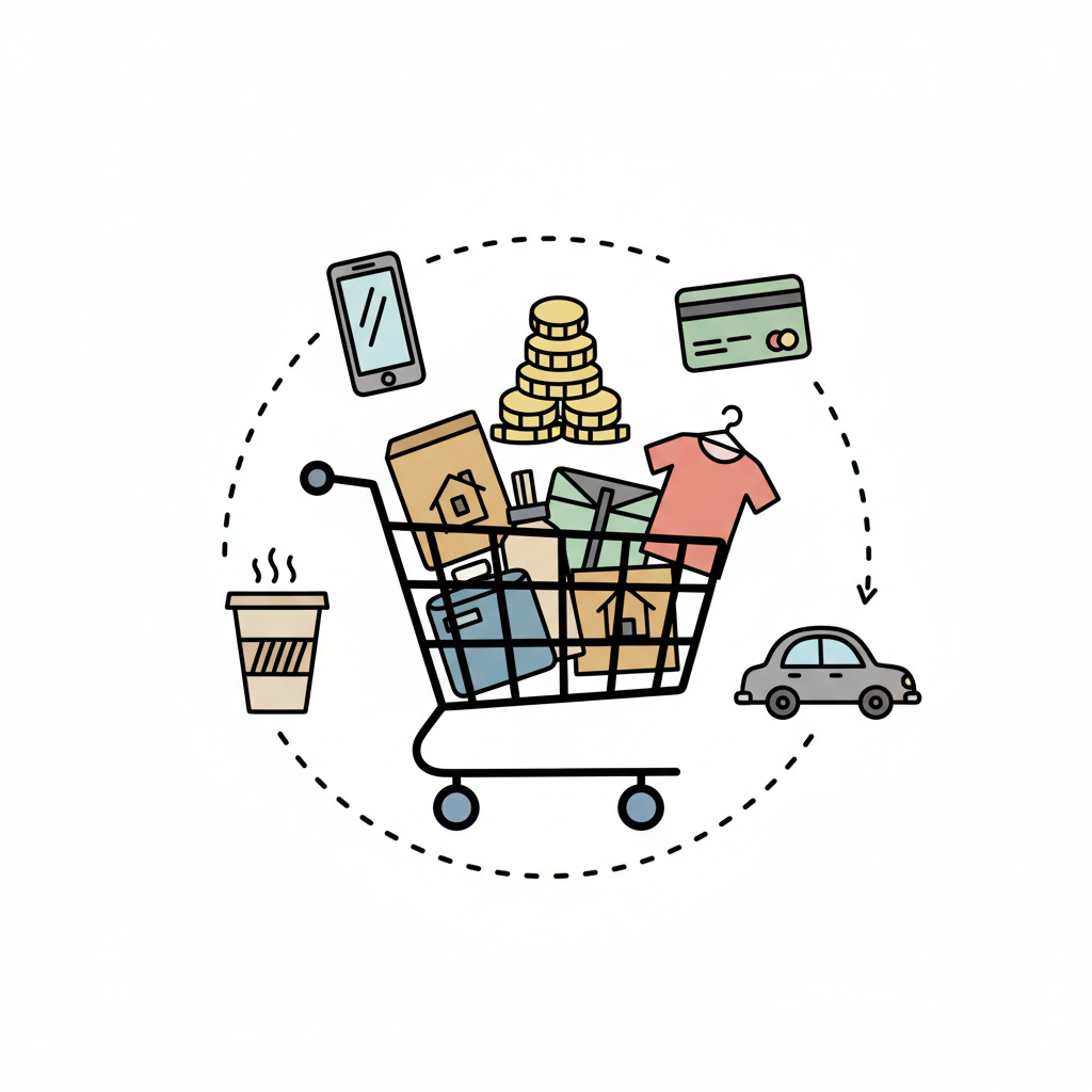 Einkaufswagen voller Güter, umgeben von Symbolen für Konsum, Finanzen und Lifestyle.