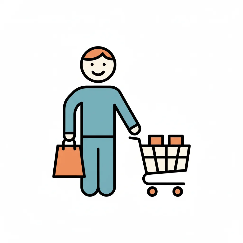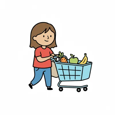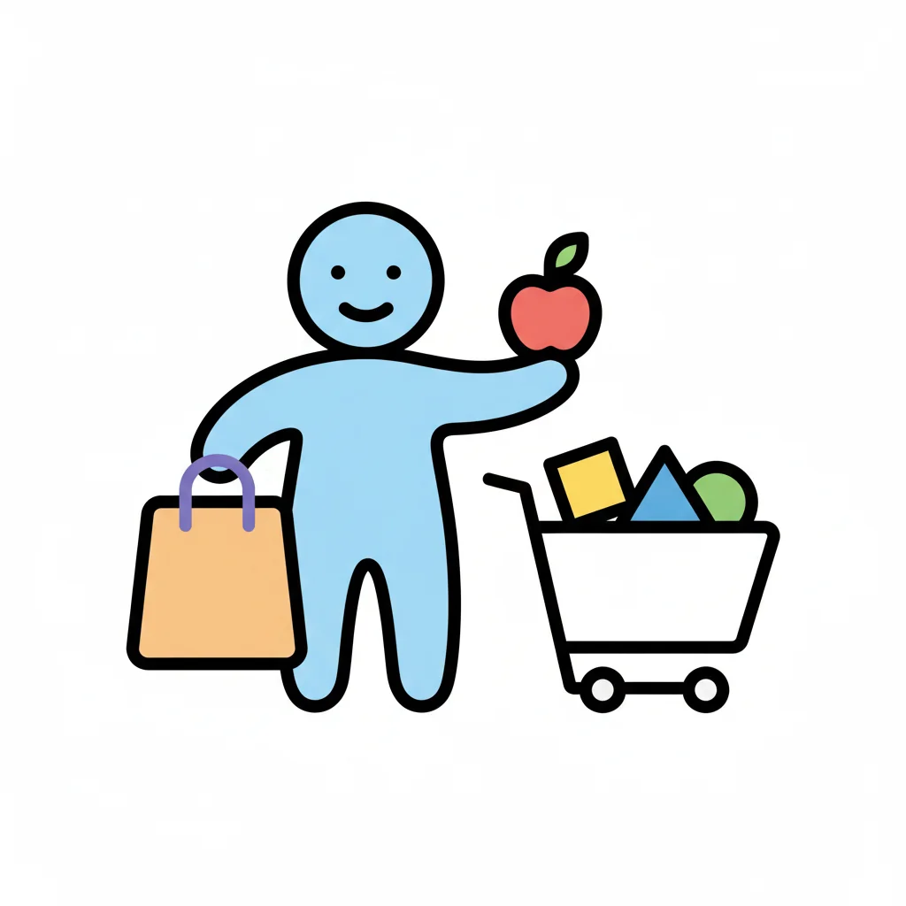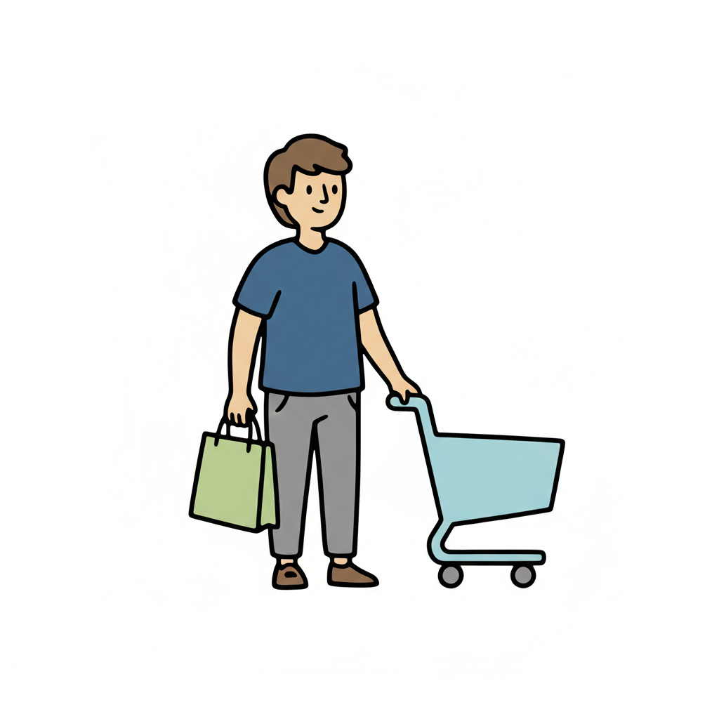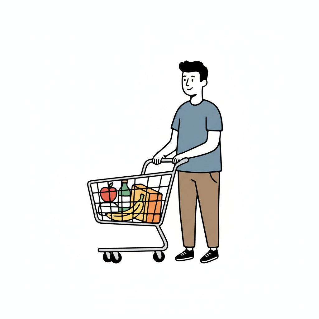 Ein lächelnder Strichmännchen-Charakter mit Einkaufstasche, Apfel und vollem Einkaufswagen.