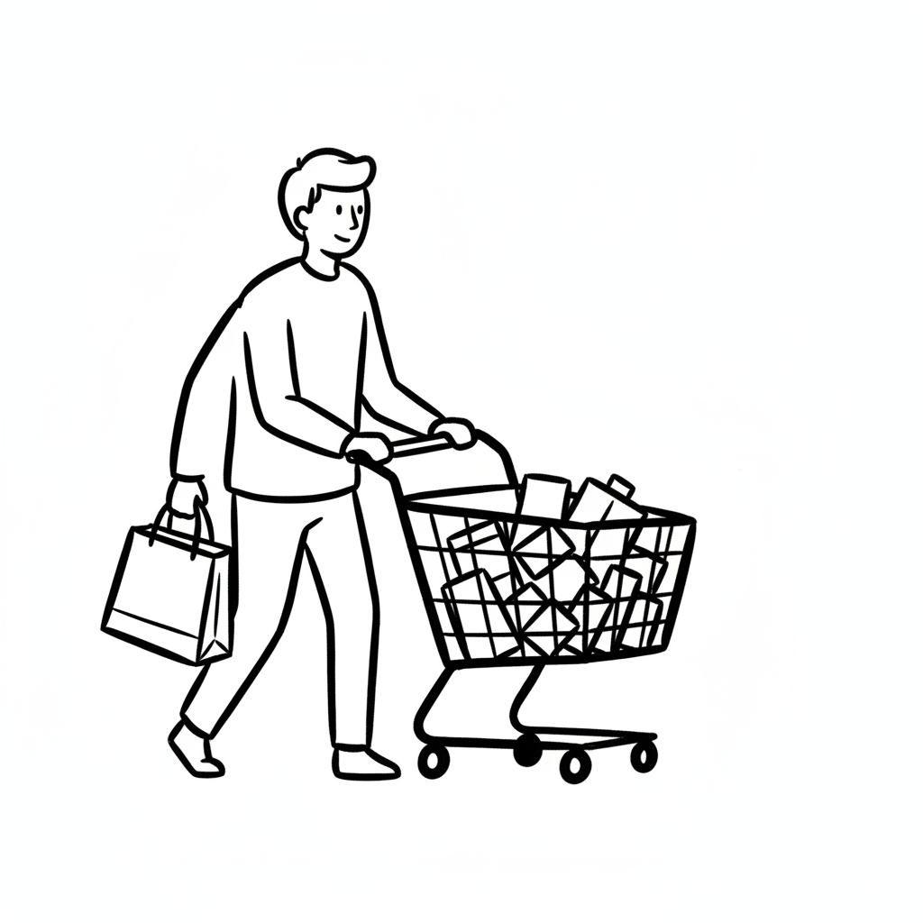 Mann schiebt vollen Einkaufswagen und trägt eine Einkaufstasche. Strichzeichnung.