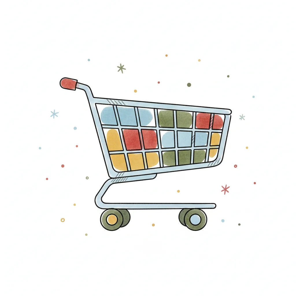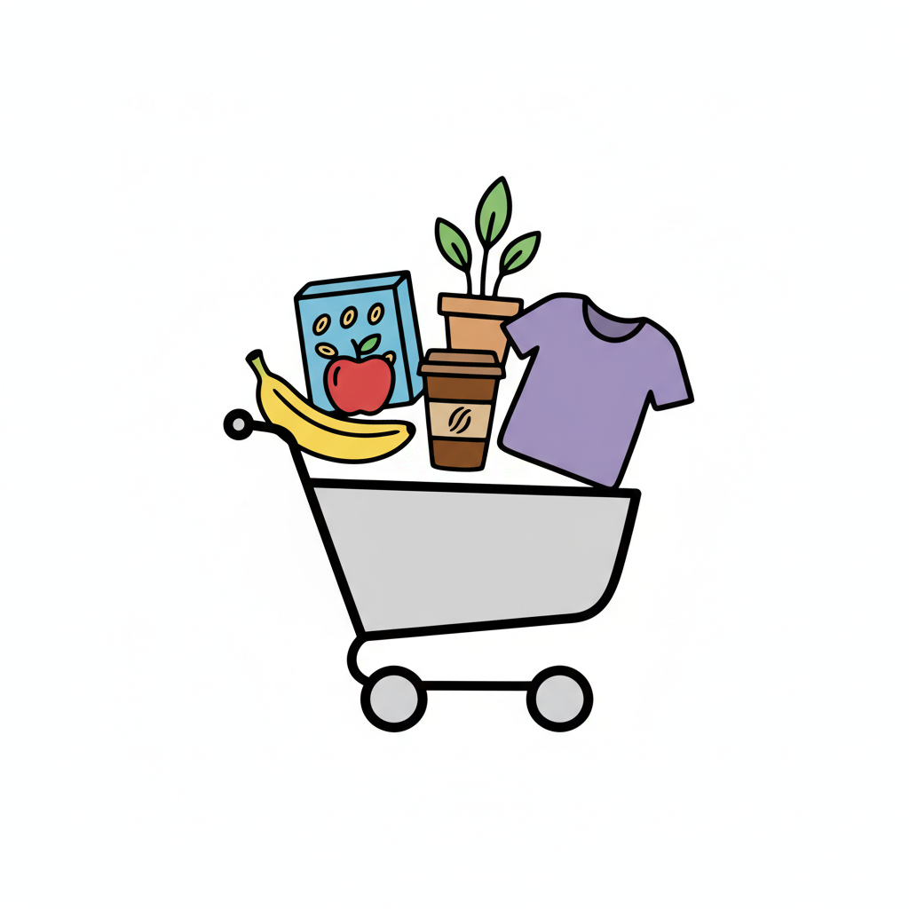 Bunter Einkaufswagen gefüllt mit Lebensmitteln, Pflanze, Kaffee und Kleidung in einfacher Illustration.
