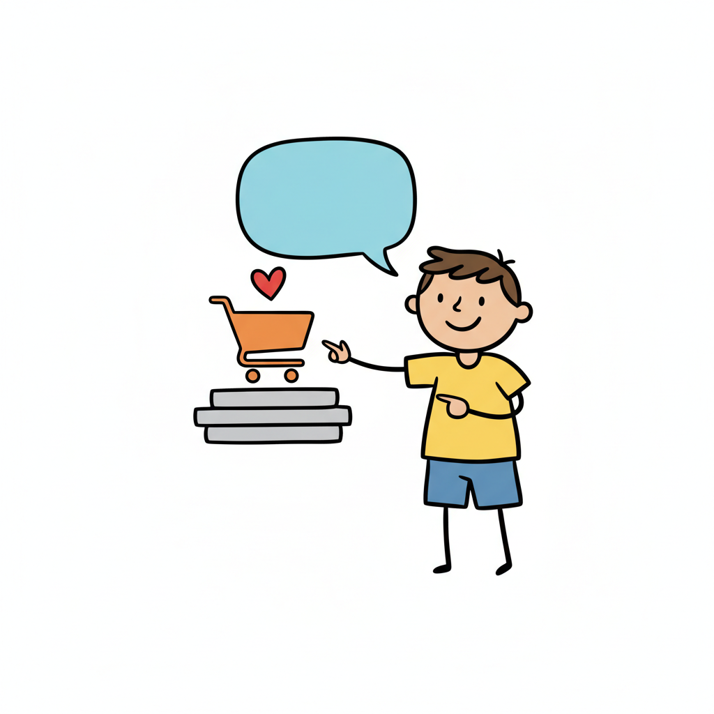 Ein Cartoon-Junge zeigt auf einen Einkaufswagen mit Herz und Sprechblase, symbolisiert Online-Shopping.