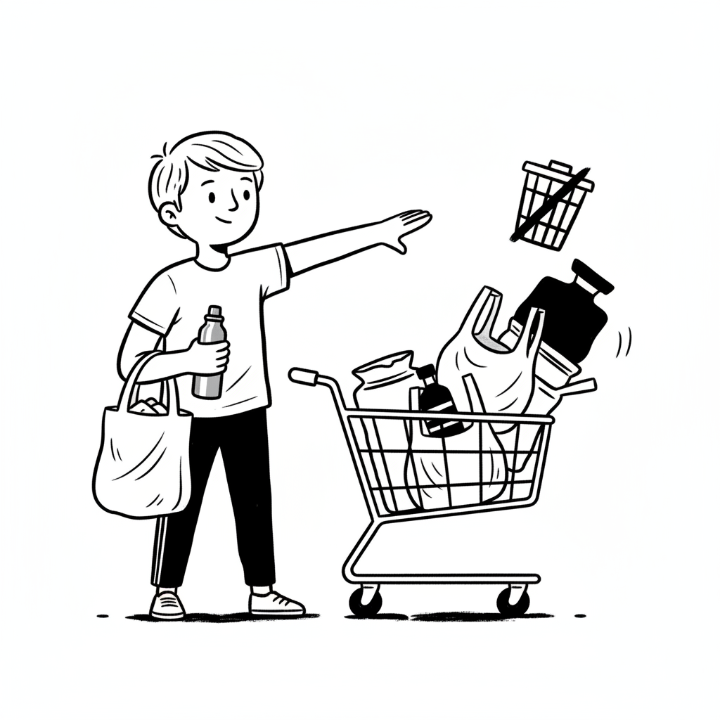 Nachhaltiges Einkaufen: Person mit Mehrwegtasche/Flasche lehnt Müll ab, Einkaufswagen voller Produkte.