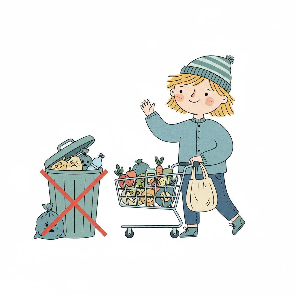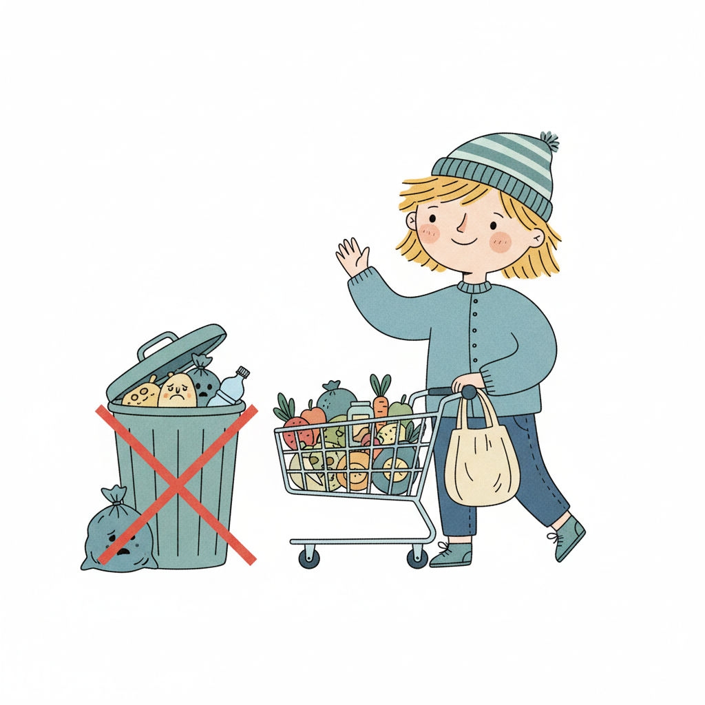 Fröhliches Kind mit Einkaufswagen voller frischer Lebensmittel, Mülltonne mit Abfall durchgestrichen.