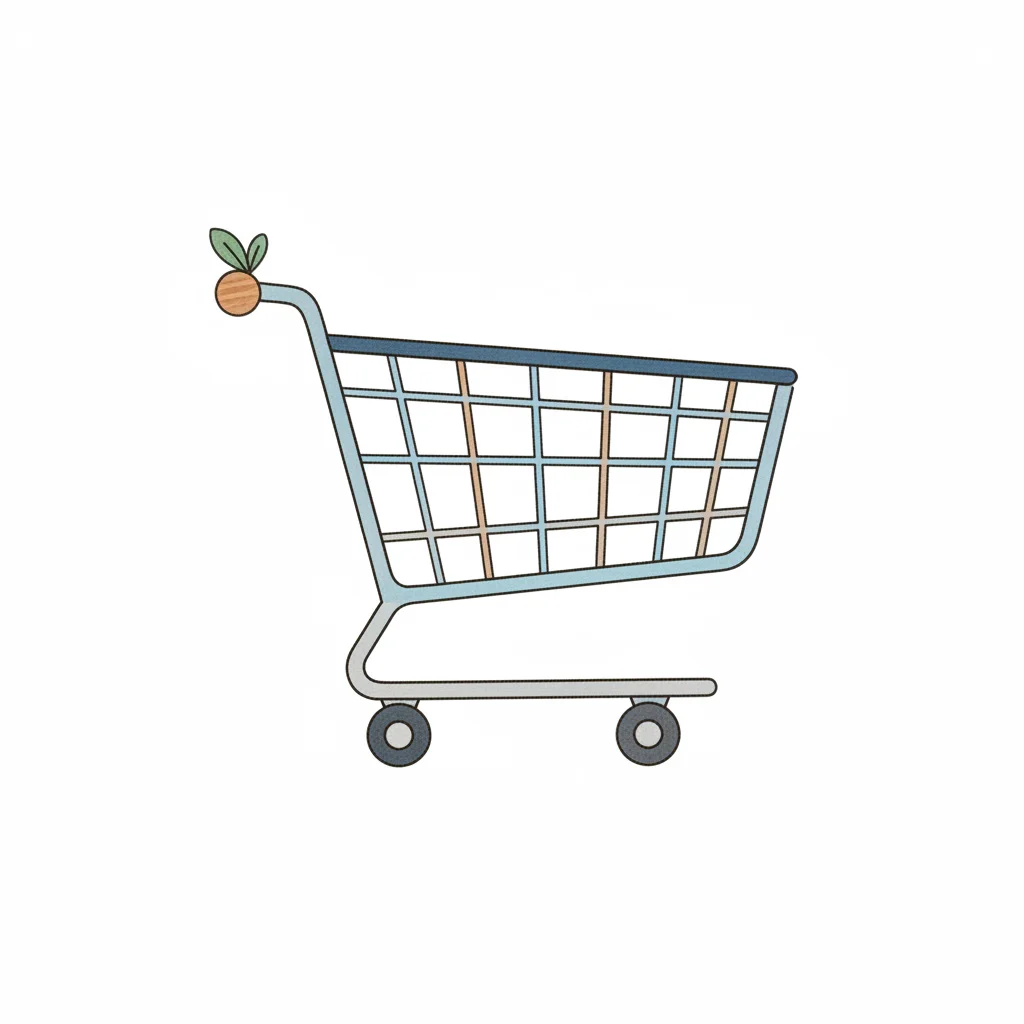 Einfache Illustration eines Einkaufswagens mit einem kleinen Spross am Griff auf weißem Hintergrund.