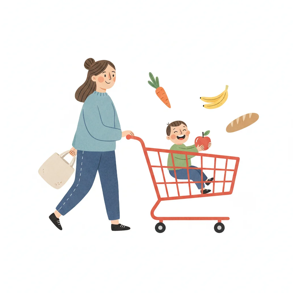 Mutter schiebt Einkaufswagen mit lachendem Kind, umgeben von schwebenden Lebensmitteln.