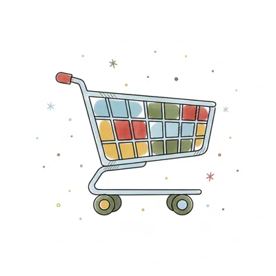 Handgezeichneter Einkaufswagen gefüllt mit bunten Taschen und einer Müslischachtel.