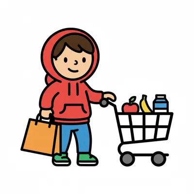 Kind im roten Hoodie schiebt Einkaufswagen mit Obst und Milch, hält Einkaufstasche.