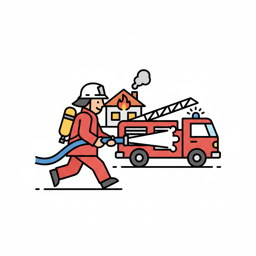 Feuerwehrmann löscht brennendes Haus mit Schlauch, daneben ein Feuerwehrauto. Einfache Illustration.