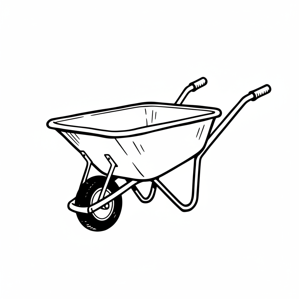 Schwarz-weiße Strichzeichnung einer leeren Schubkarre, bereit für den Einsatz.