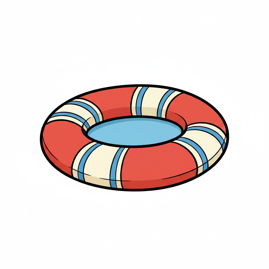 Cartoon-Rettungsring in Rot, Weiß und Blau, bereit für den Einsatz im Wasser.