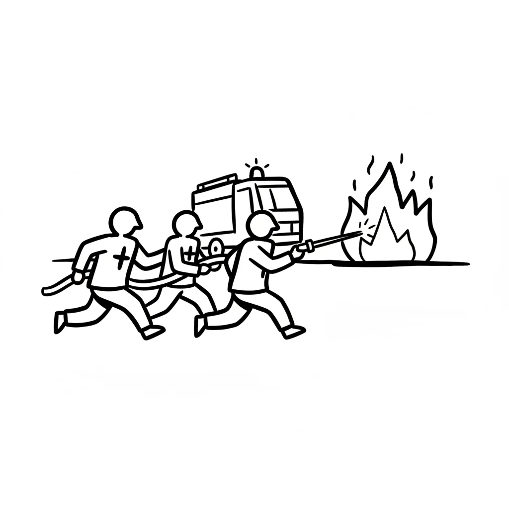 Drei Einsatzkräfte löschen einen Brand mit einem Schlauch, ein Feuerwehrauto steht bereit.