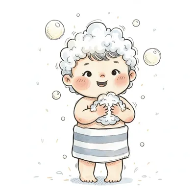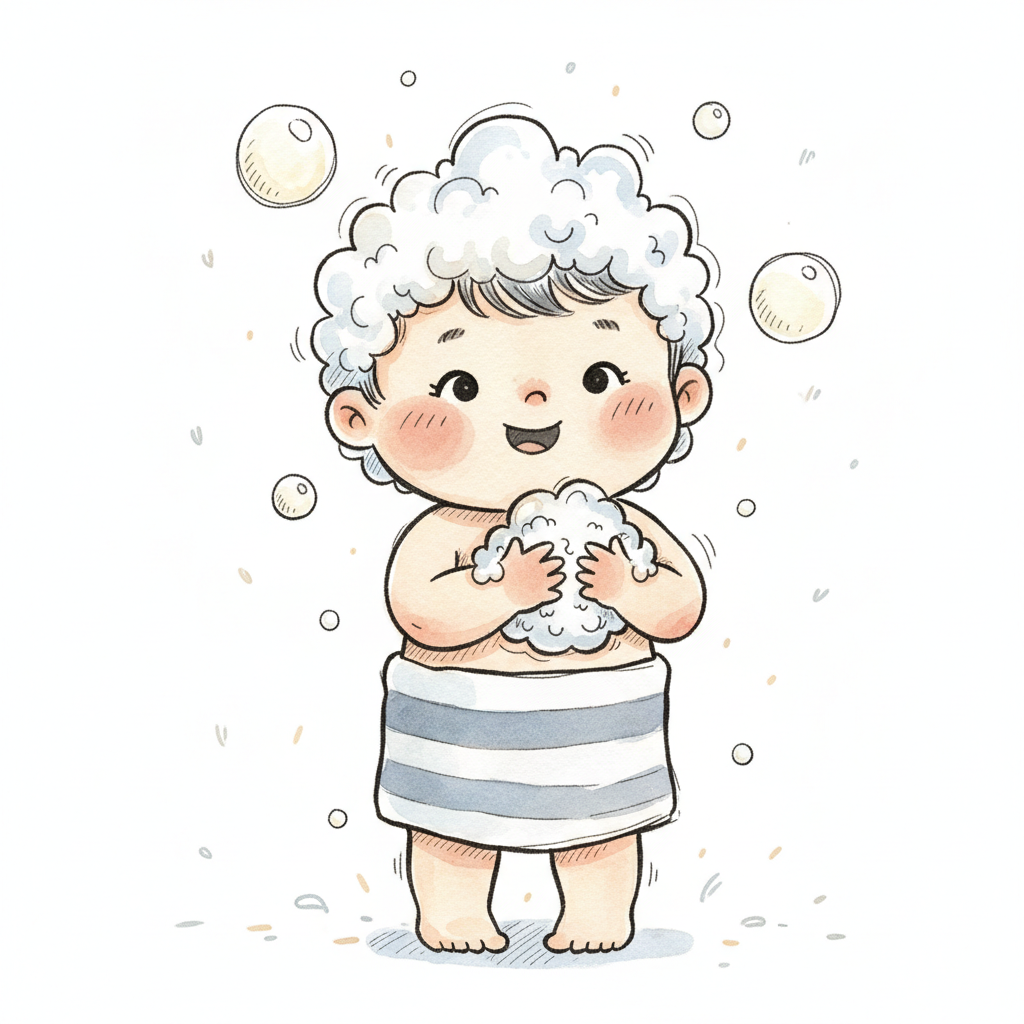 Niedliches Cartoon-Baby mit Seifenschaum auf dem Kopf und in den Händen, lächelt fröhlich.