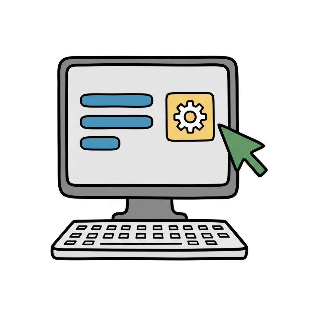 Illustration eines Desktop-Computers mit Mauszeiger, der auf ein Zahnrad-Symbol zeigt.