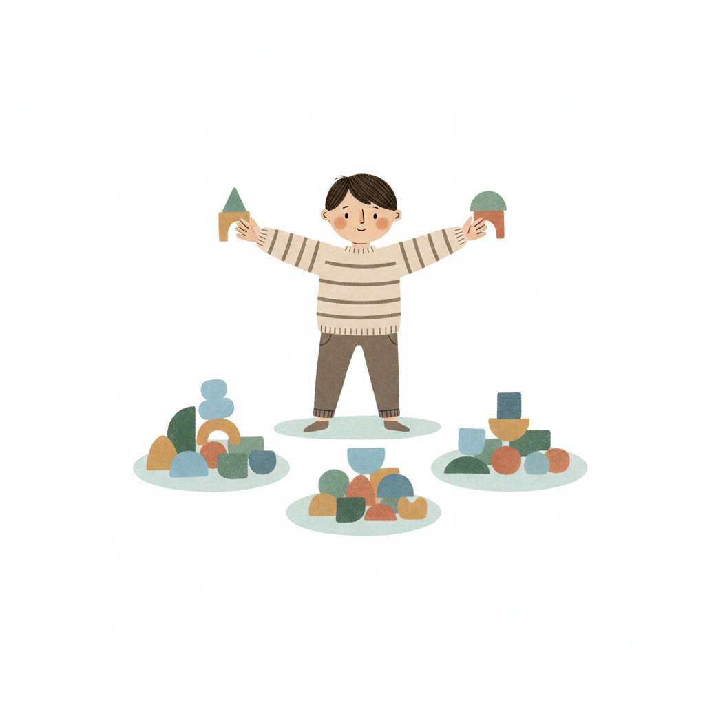 Handgezeichnete Kinderbuchillustration im modernen skandinavisch-nordischen Stil. Minimalistische, freundliche mit einfachen Formen und leicht unregelmäßigen, handgezeichneten Linien. Ruhige, gedeckte Farbpalette, viel freie Fläche, reduzierte Details, sanfte Papier- oder Aquarellstruktur. Warme, ruhige, leicht humorvolle Stimmung, flächige Komposition ohne starke Perspektive, moderner nordischer Illustrationsstil, charmant und zeitlos. Hoher Kontrast, isoliert auf weißem Hintergrund. WICHTIG: KEIN TEXT im Bild. Hintergrund: Rein weiß.
