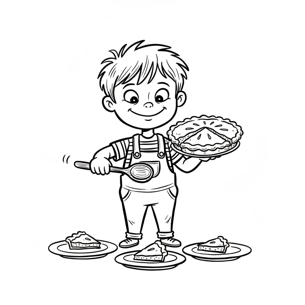 Ein lächelnder Junge serviert Kuchenstücke von einem ganzen Kuchen auf Teller.