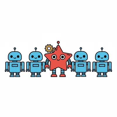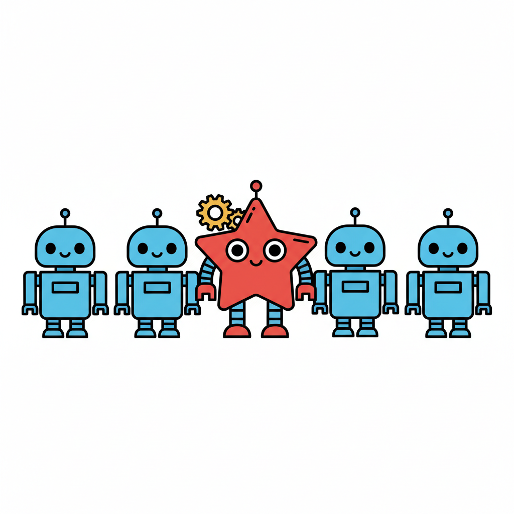 Ein roter Stern-Roboter mit Zahnrad sticht aus einer Reihe blauer Roboter hervor.