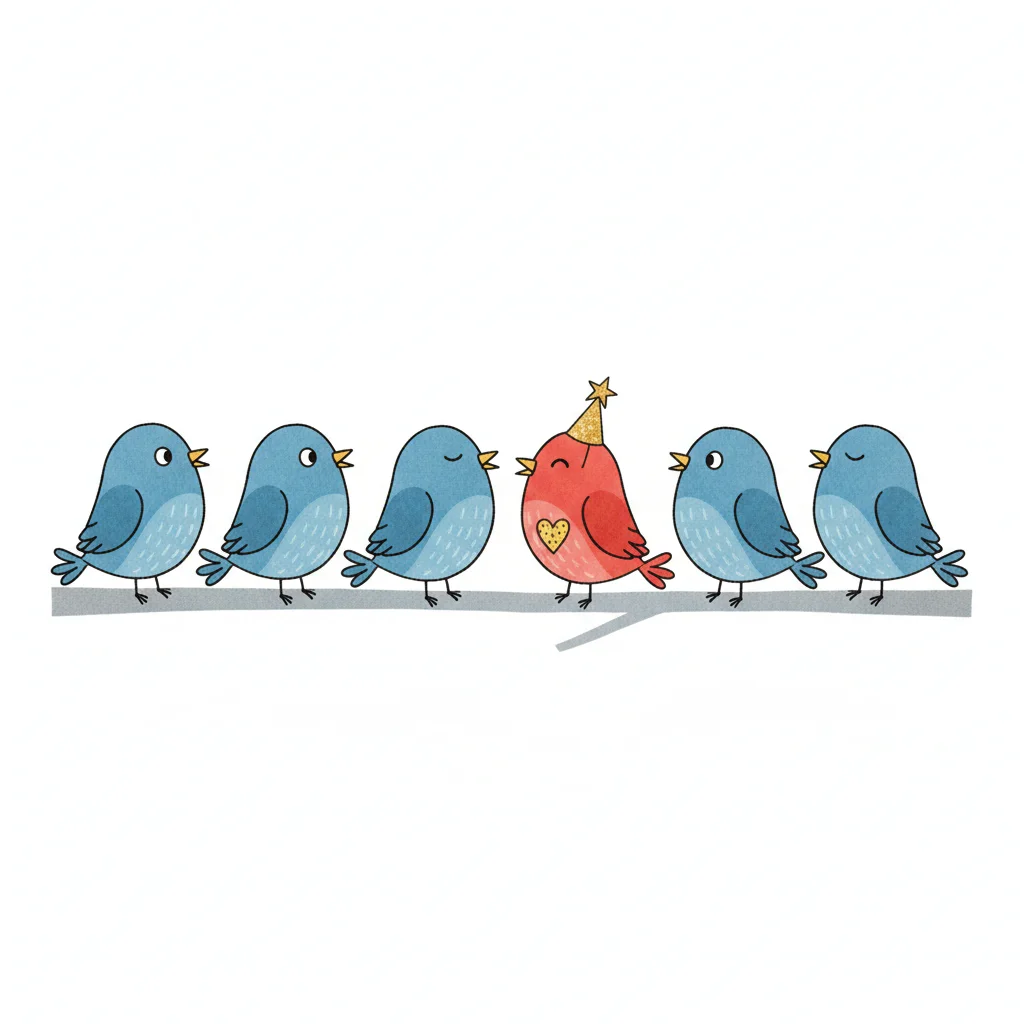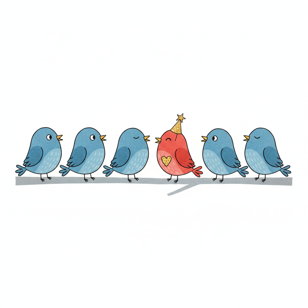 Ein roter Vogel mit Partyhut und Herz sticht zwischen sechs blauen Vögeln auf einem Ast hervor.