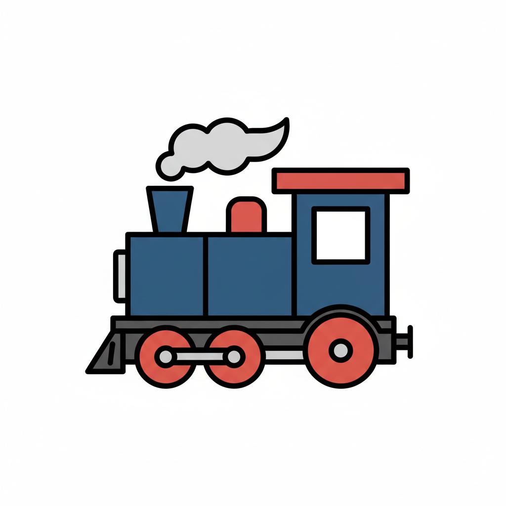 Stilisierte blaue Dampflokomotive mit roten Rädern und Rauch aus dem Schornstein auf weißem Grund.